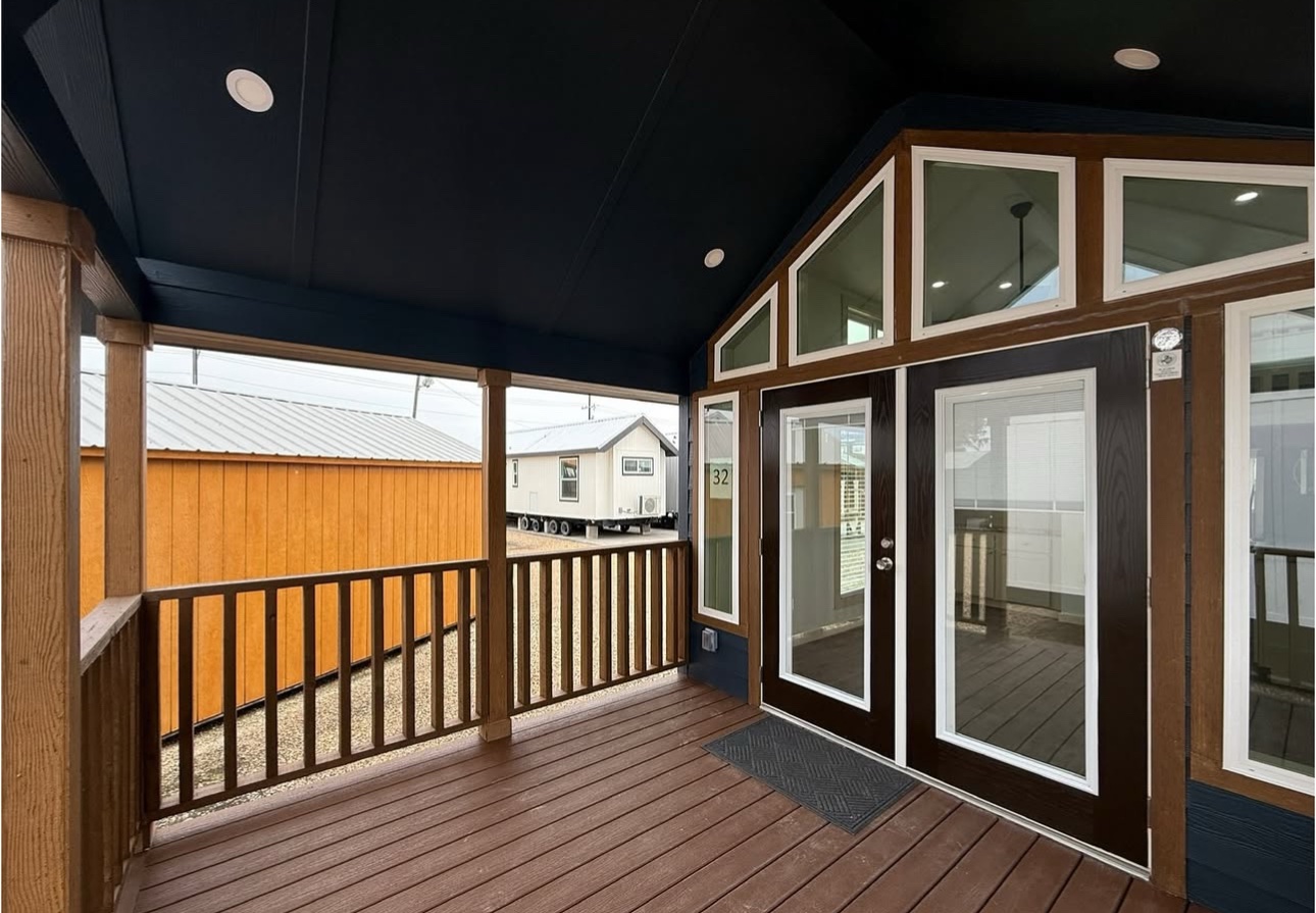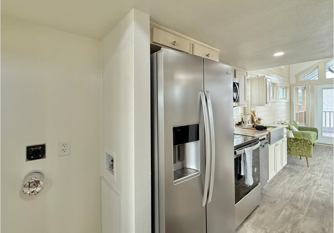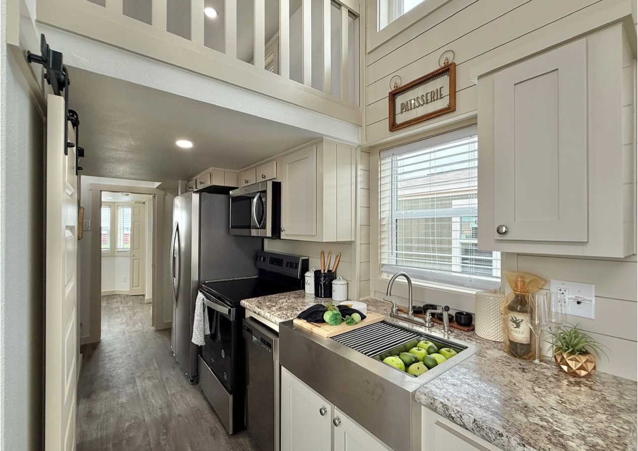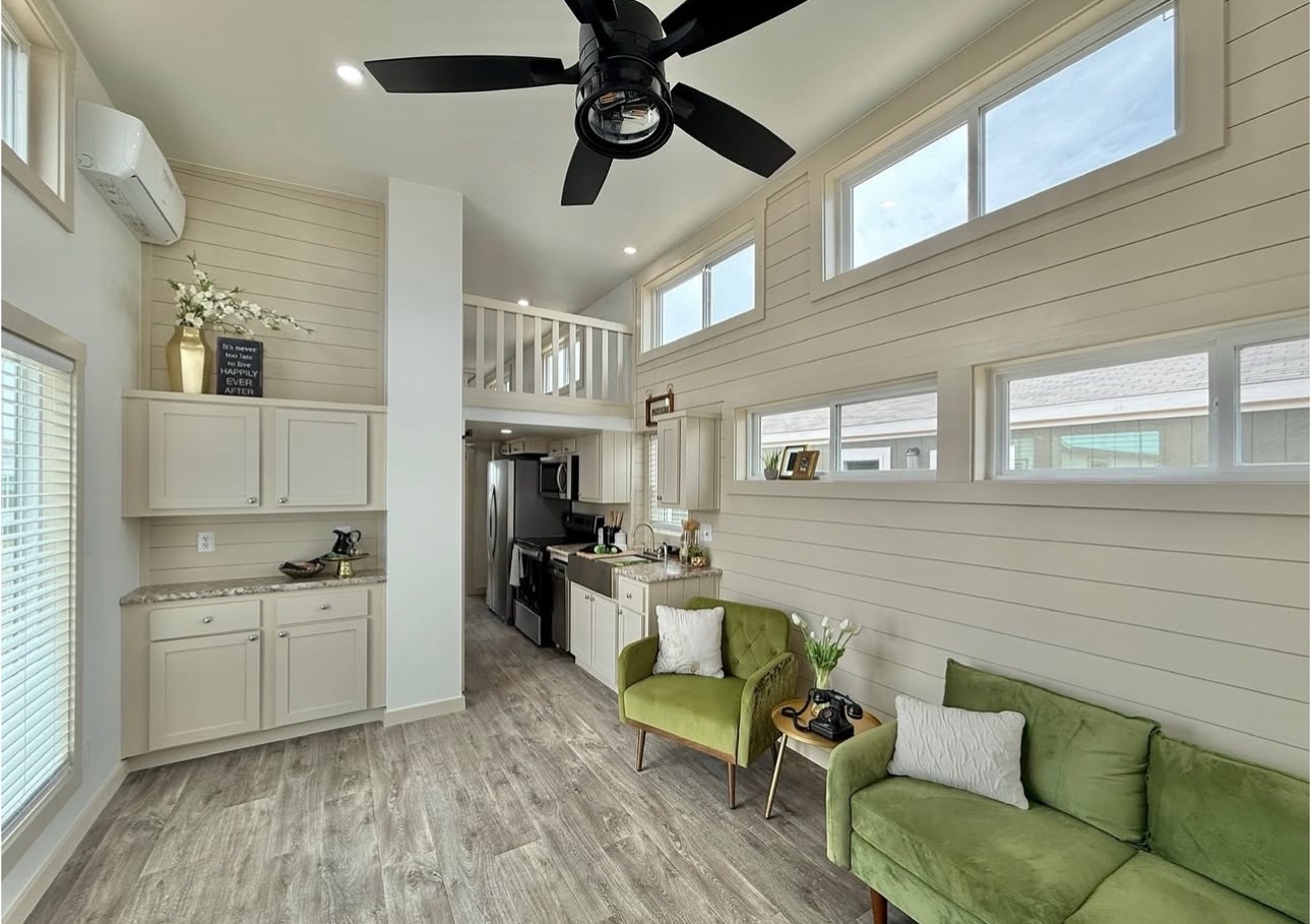 In this home you get double front doors, a large front porch, comfortable living area, dining nook, galley kitchen with full size appliances, space for a stackable washer/dryer, and a bedroom that will easily fit a queen size bed with a bay window that allows for a desk or dresser.