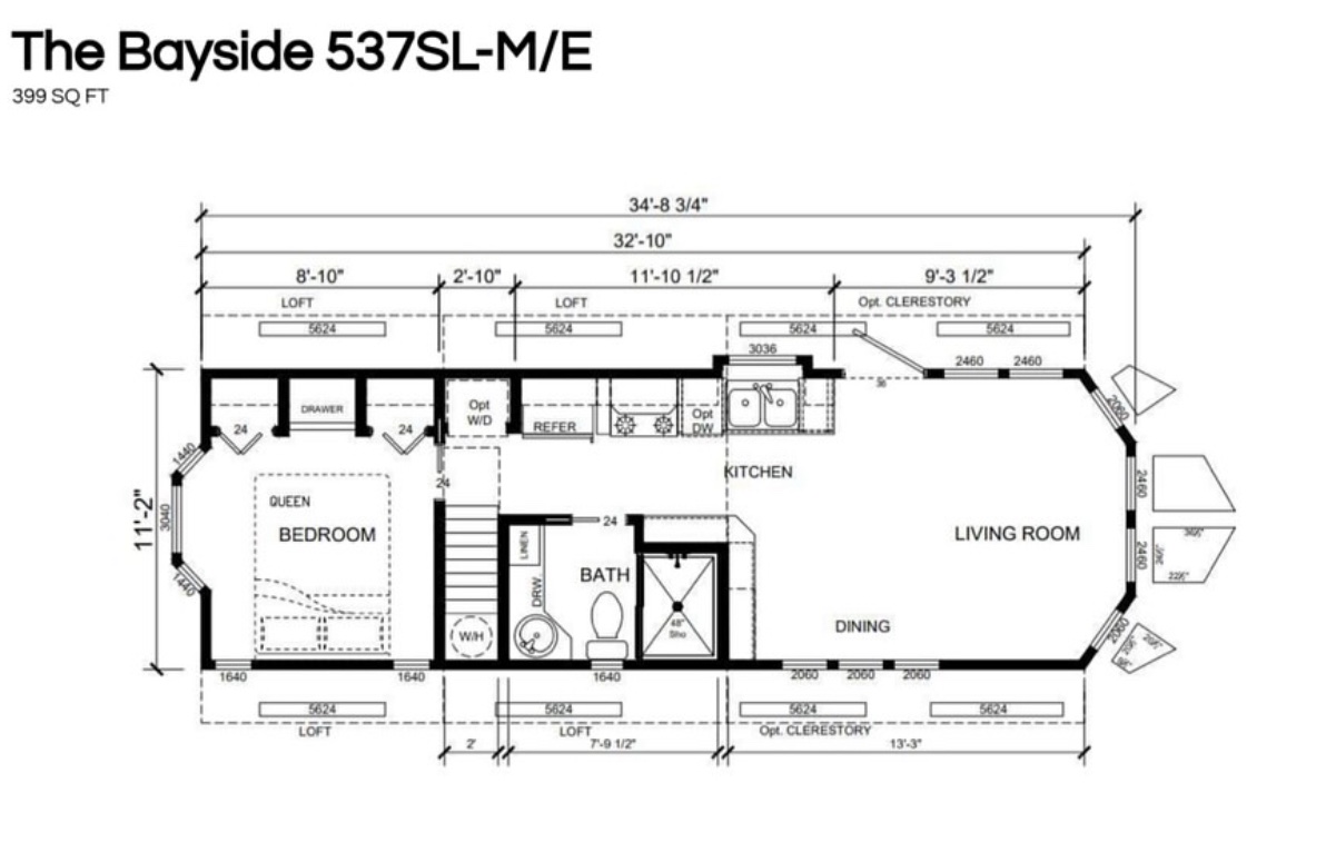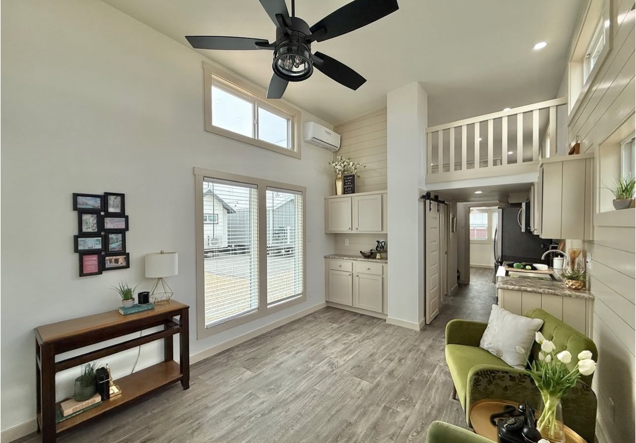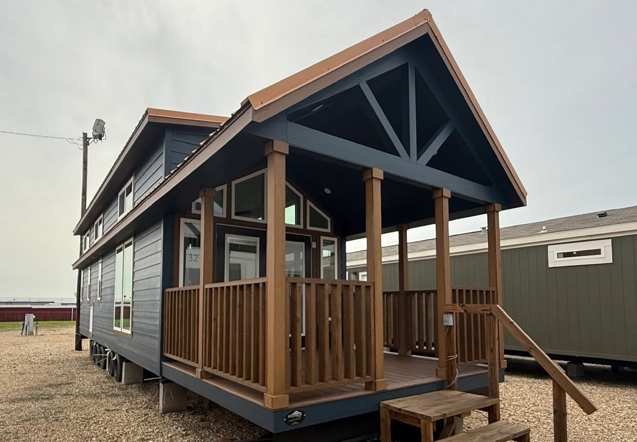 In this home you get double front doors, a large front porch, comfortable living area, dining nook, galley kitchen with full size appliances, space for a stackable washer/dryer, and a bedroom that will easily fit a queen size bed with a bay window that allows for a desk or dresser.