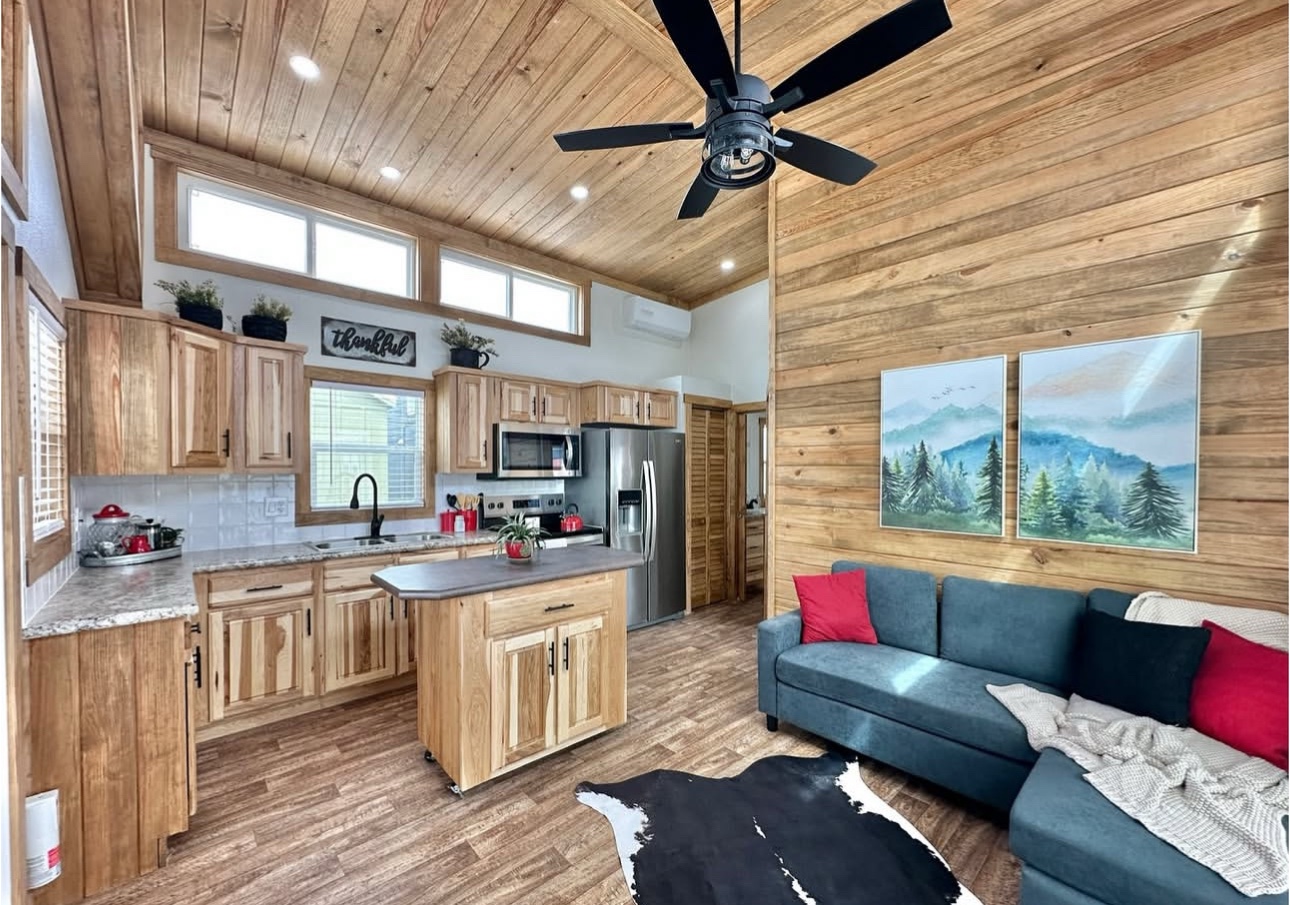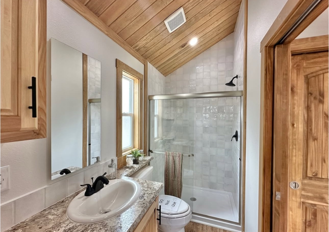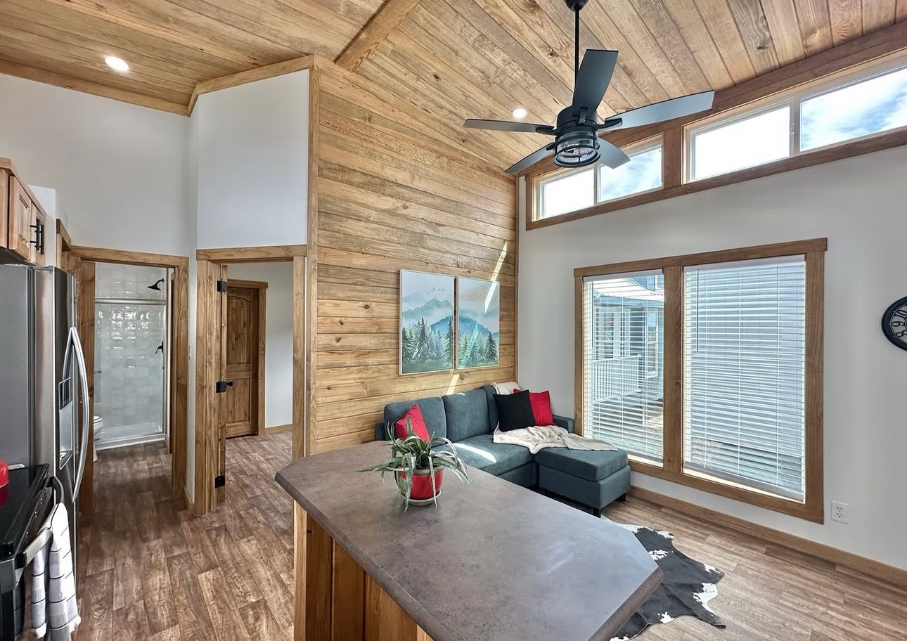 -full white tile shower in the bathroom -stained southern yellow pine trim, ceiling and accent wall in the living room.