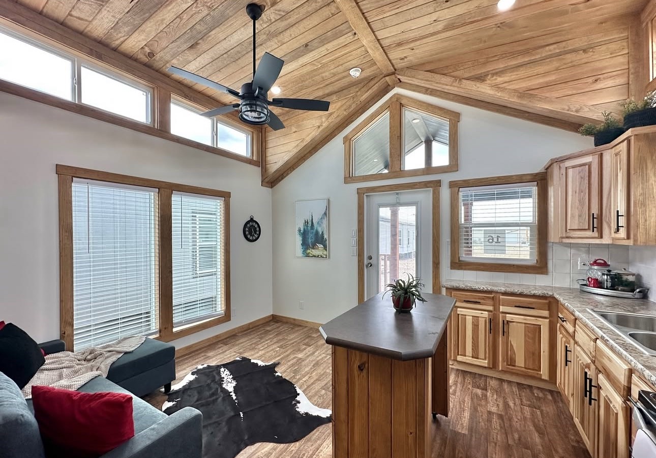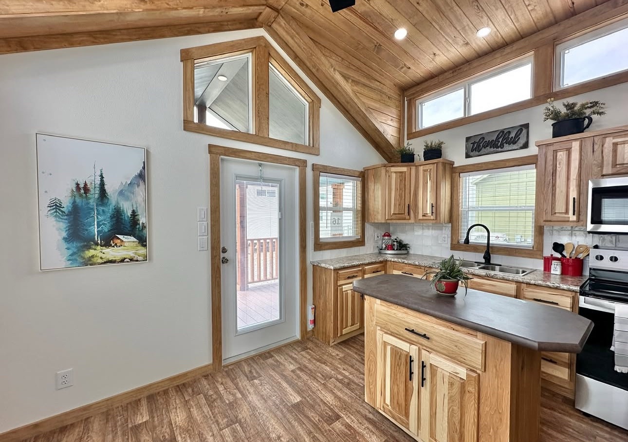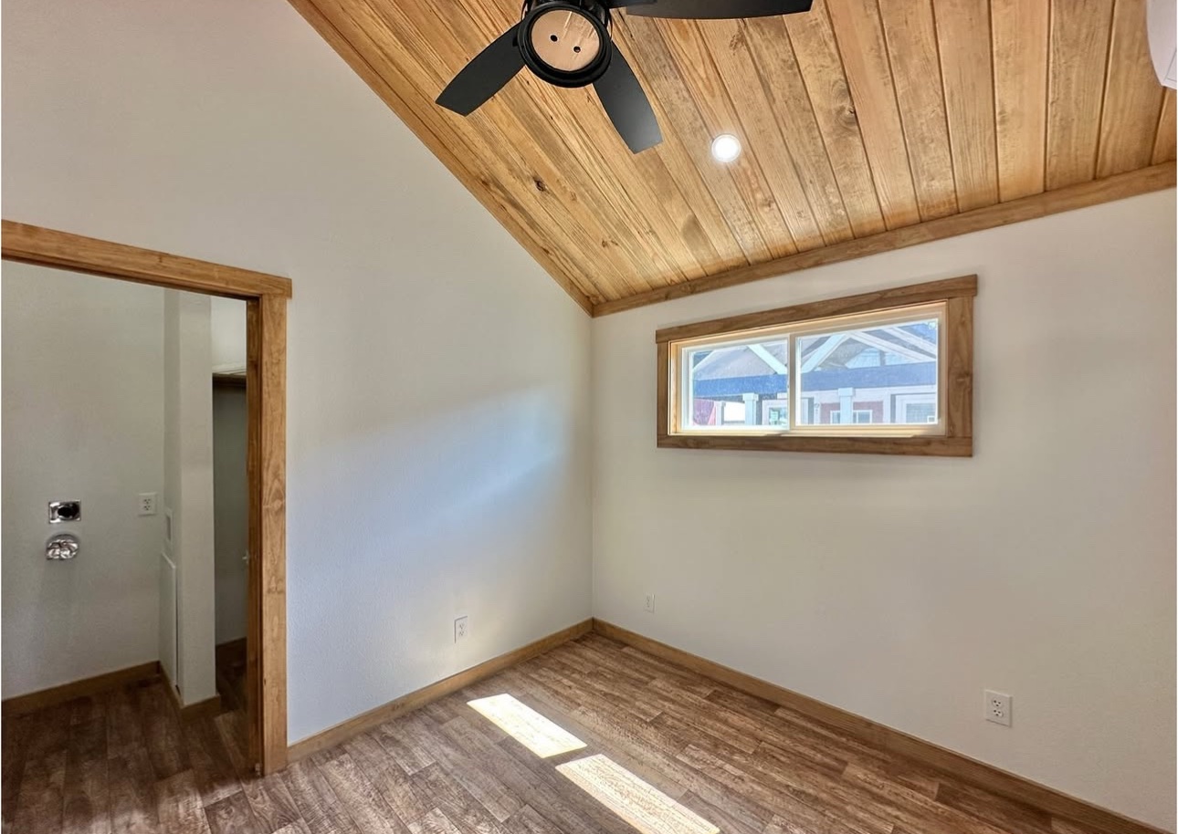 -full white tile shower in the bathroom -stained southern yellow pine trim, ceiling and accent wall in the living room.