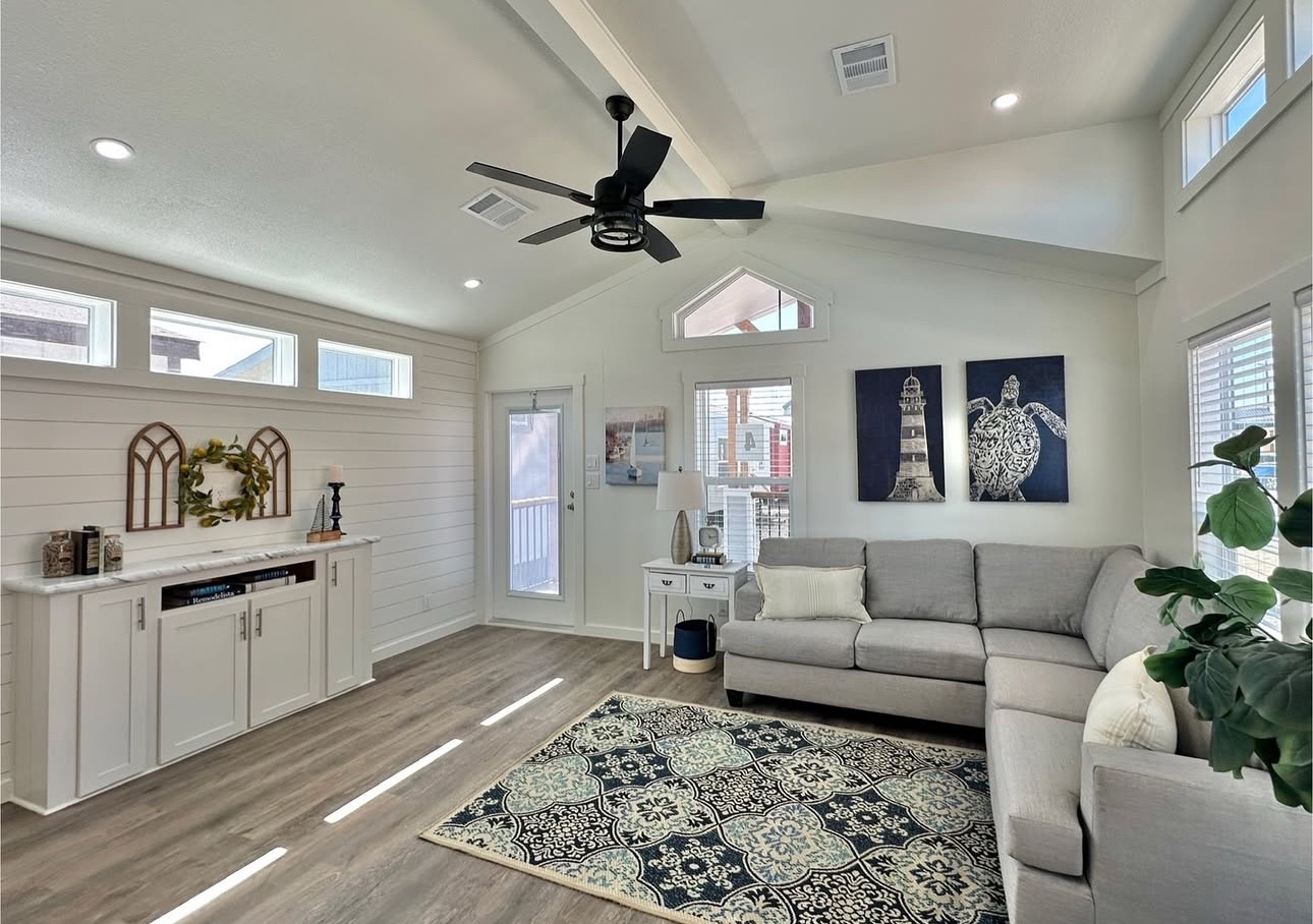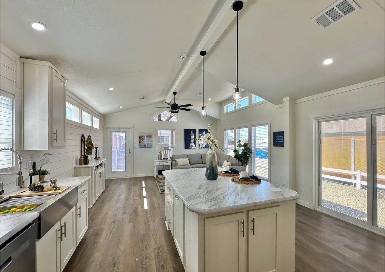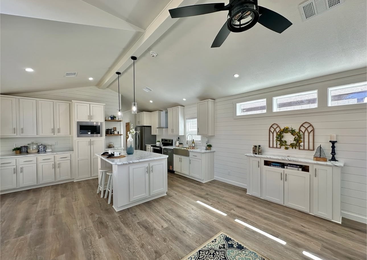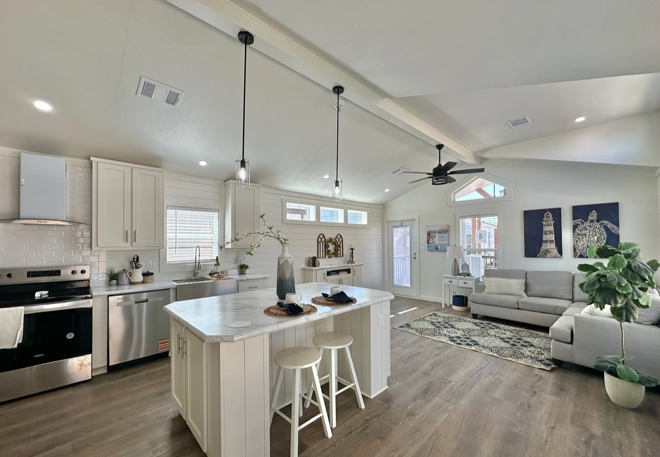This not so tiny home boasts a large island and a gorgeous beam in the main living area with a shiplap accent wall.