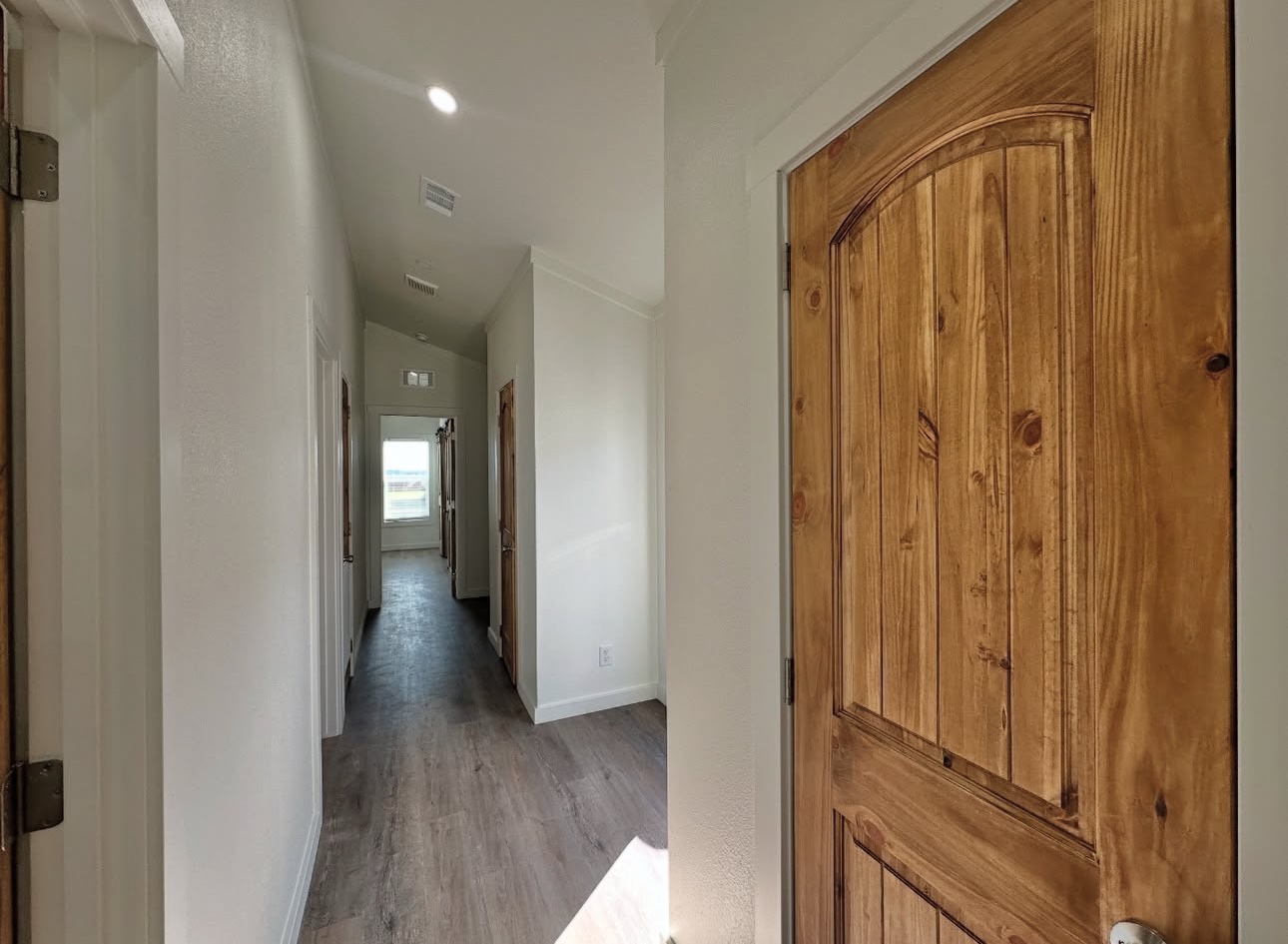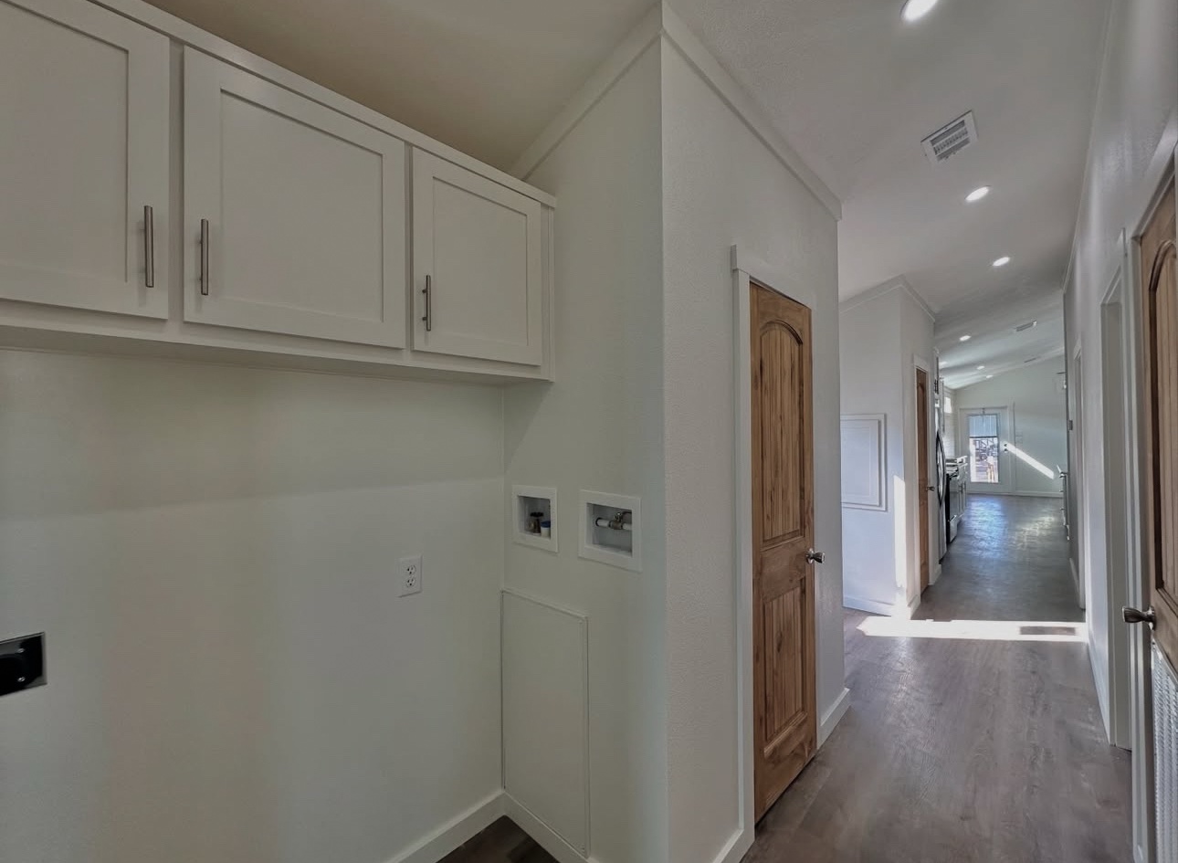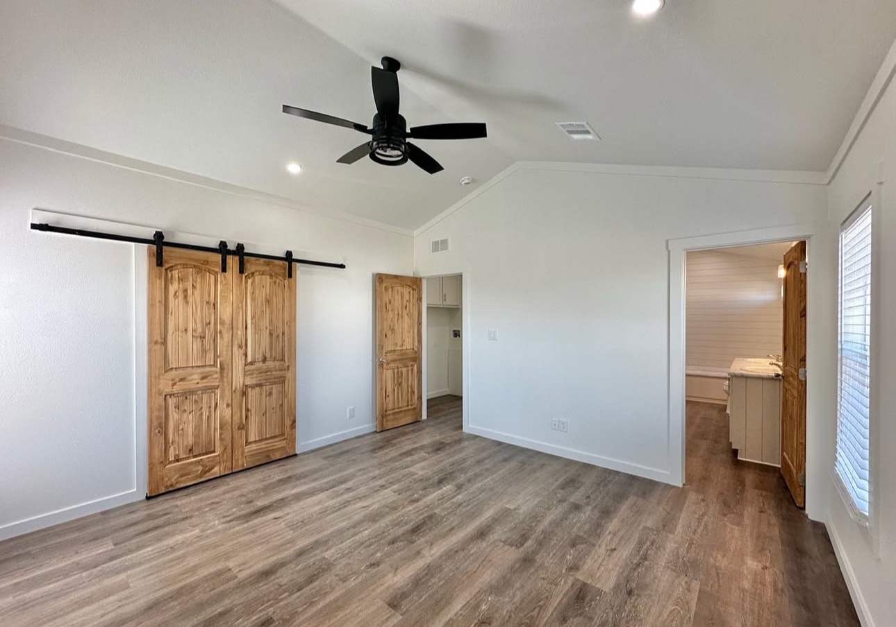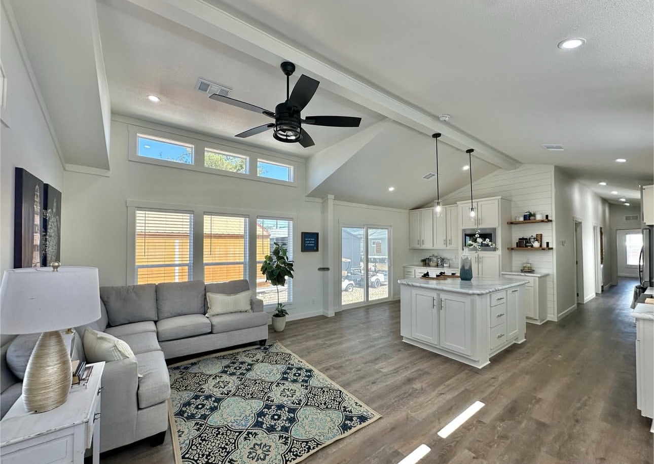 This not so tiny home boasts a large island and a gorgeous beam in the main living area with a shiplap accent wall.