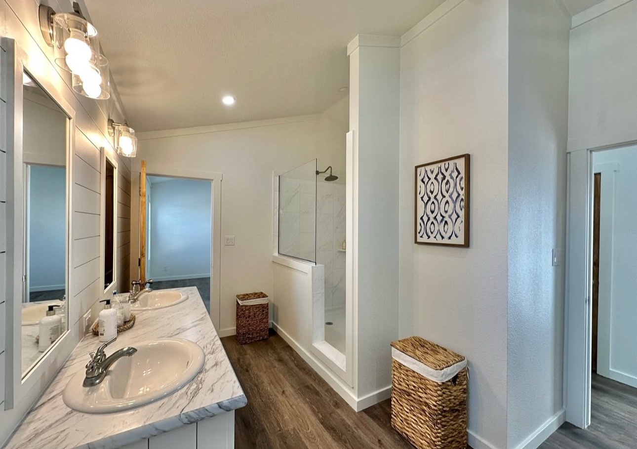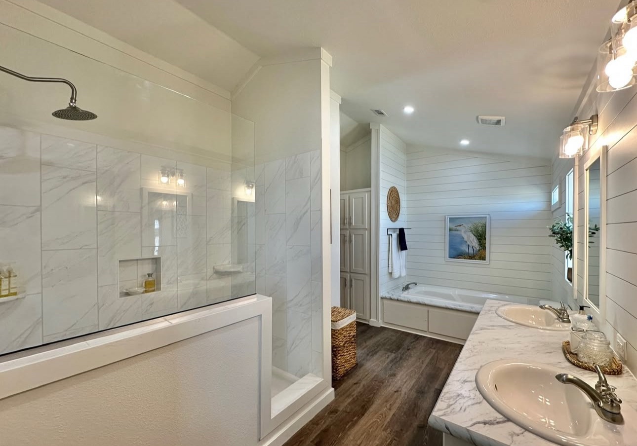 The large bathroom has a beautiful, large mosaic tile shower with a separate bathtub and shiplap accents behind the mirrors.